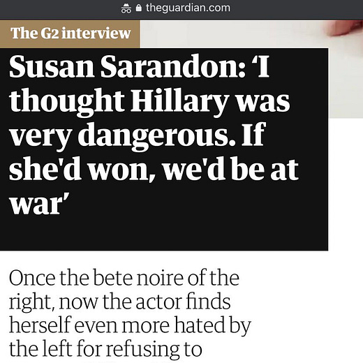 Hardly a week goes by without some establishment-defending Democrat blaming Susan Sarandon for everything that goes wrong in America. Much of the hostility toward her stems from the 2016 Democratic primary, when Sarandon, a Bernie Sanders supporter, was sharply critical of Hillary Clinton.